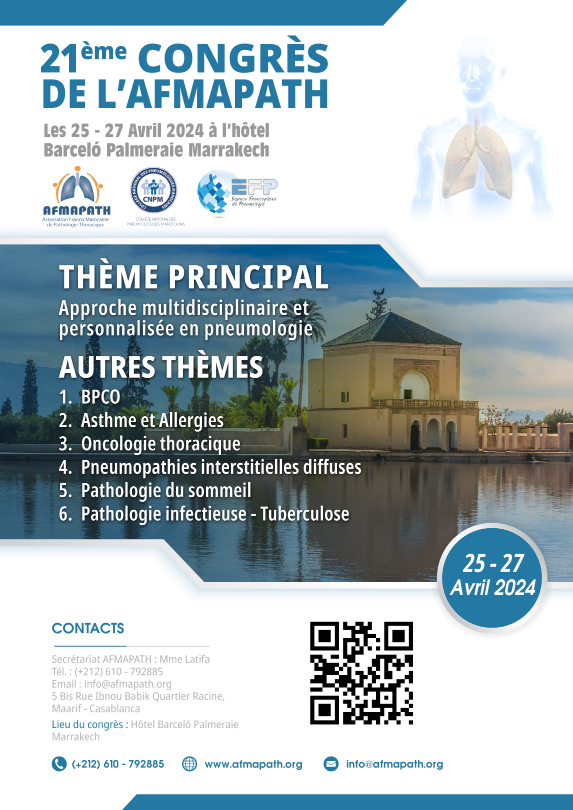 Le thème principal retenu du congrès se focalise sur l’approche multidisciplinaire et personnalisée en pneumologie, d’autres thèmes seront abordés : BPCO, Asthme et allergies, l’oncologie thoracique, les pneumopathies interstitielles diffuses, la pathologie du sommeil, la pathologie infectieuse et la tuberculose. Le comité scientifique a également prévu des sessions de posters pour le congrès. Vous trouverez dans ce dépliant toutes les informations sur les modalités d’inscription. Ce formulaire en ligne vous permet de choisir votre forfait et de réserver votre inscription au congrès. Nous sommes ravis de vous accueillir dans cette belle ville de Marrakech, pour enrichir nos connaissances tout en profitant des moments de détente et de convivialité. Dr Abdelilah TEBAY Pour le comité d’organisation |