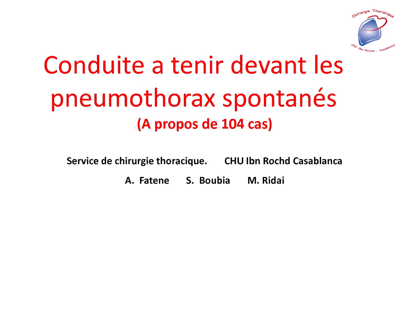 Conduite à tenir devant les pneumothorax spontanés. (à propos de 104 cas). A. FATENE